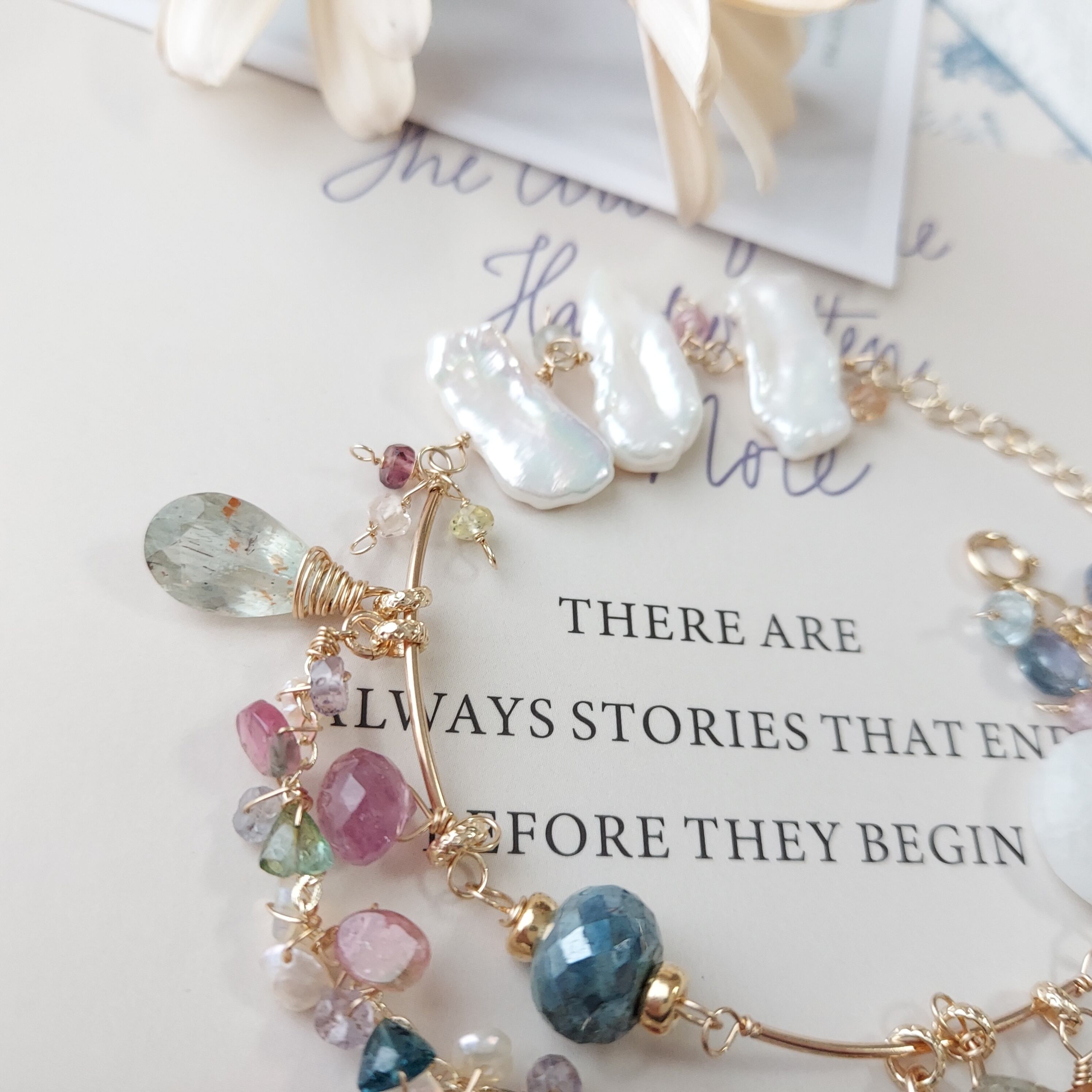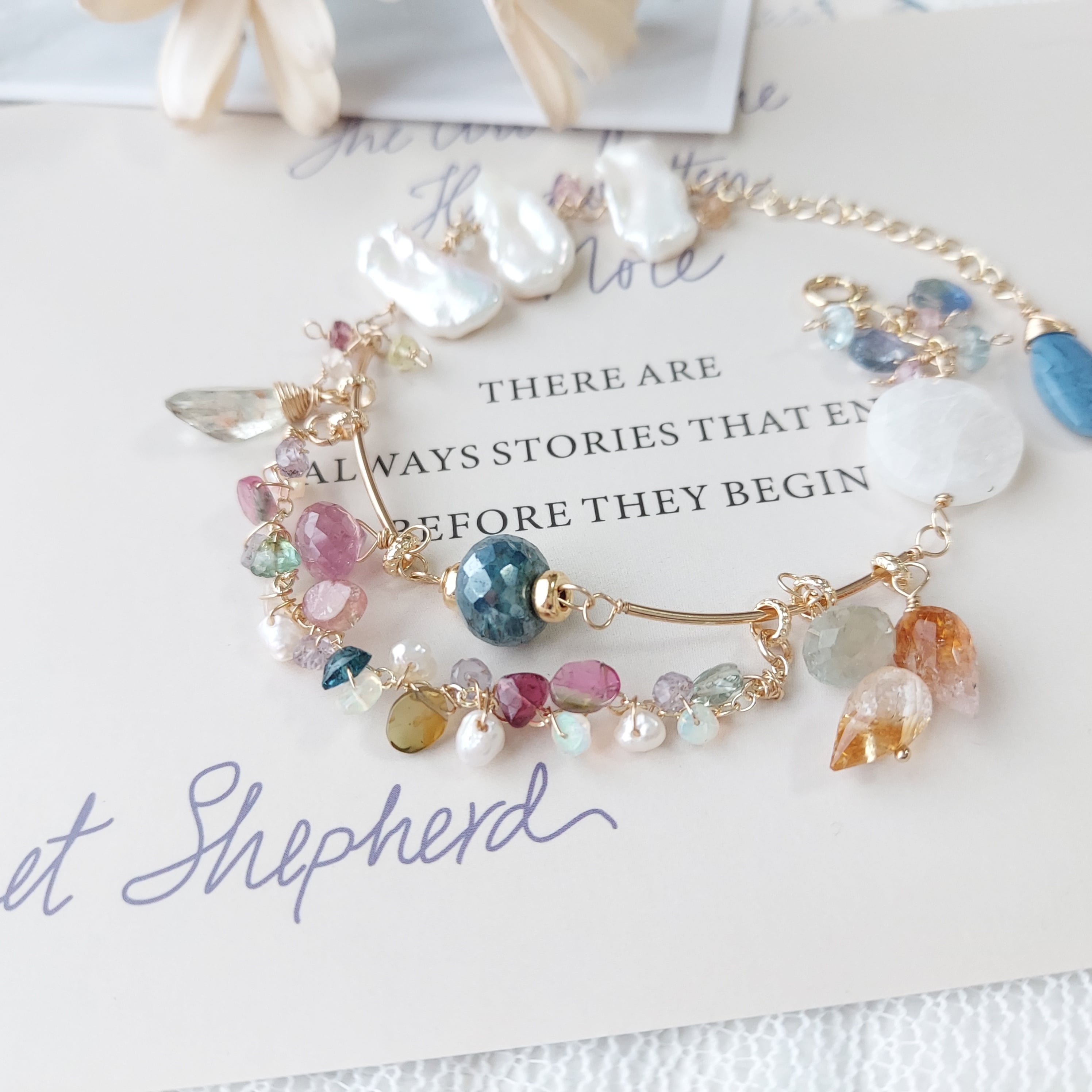 メインはセンターのコーティングカイヤナイトですが、つぼみシトリンや、ニュアンスカラーのサファイアもとても可愛いので、それぞれの個性が楽しめるブレスレットかなと思います♡