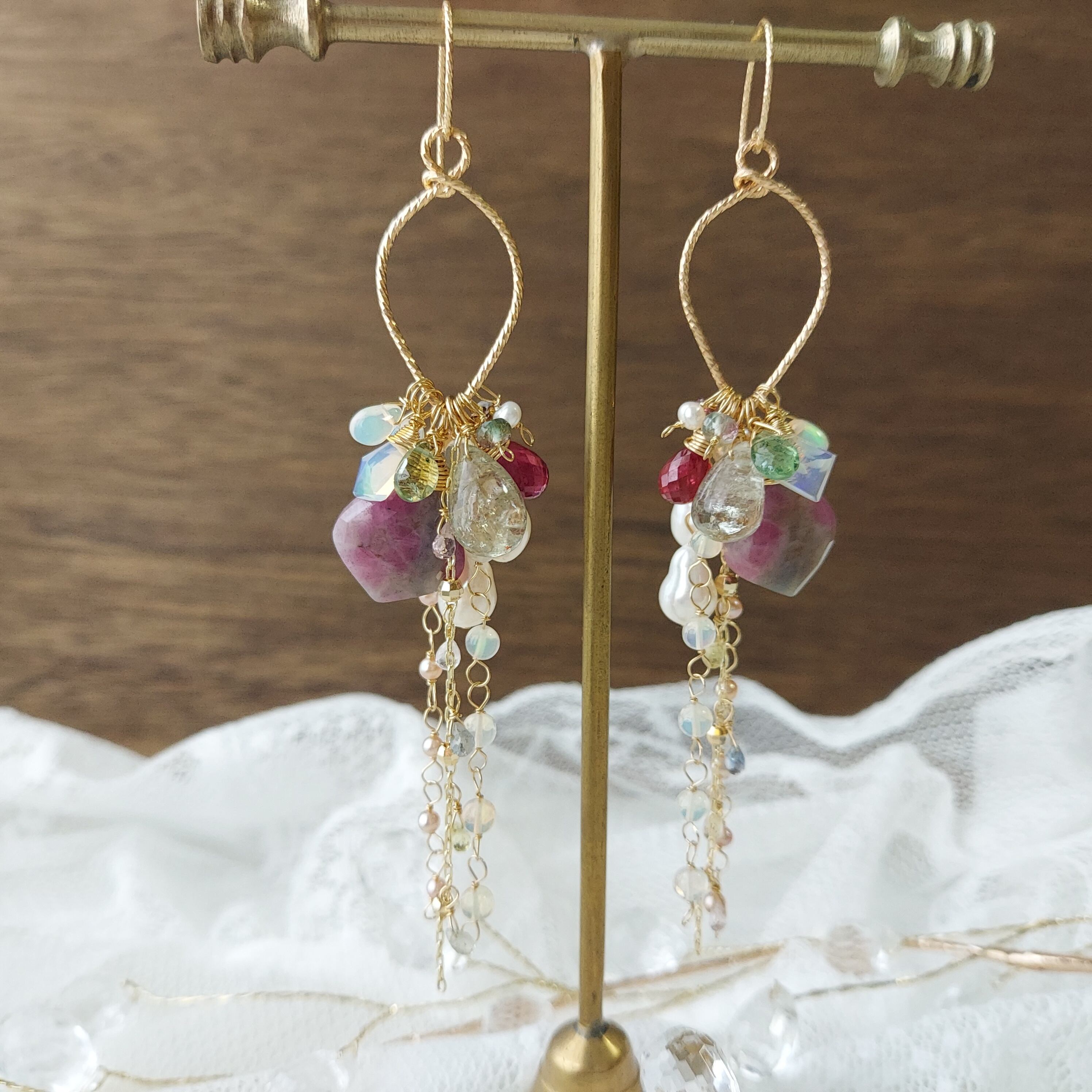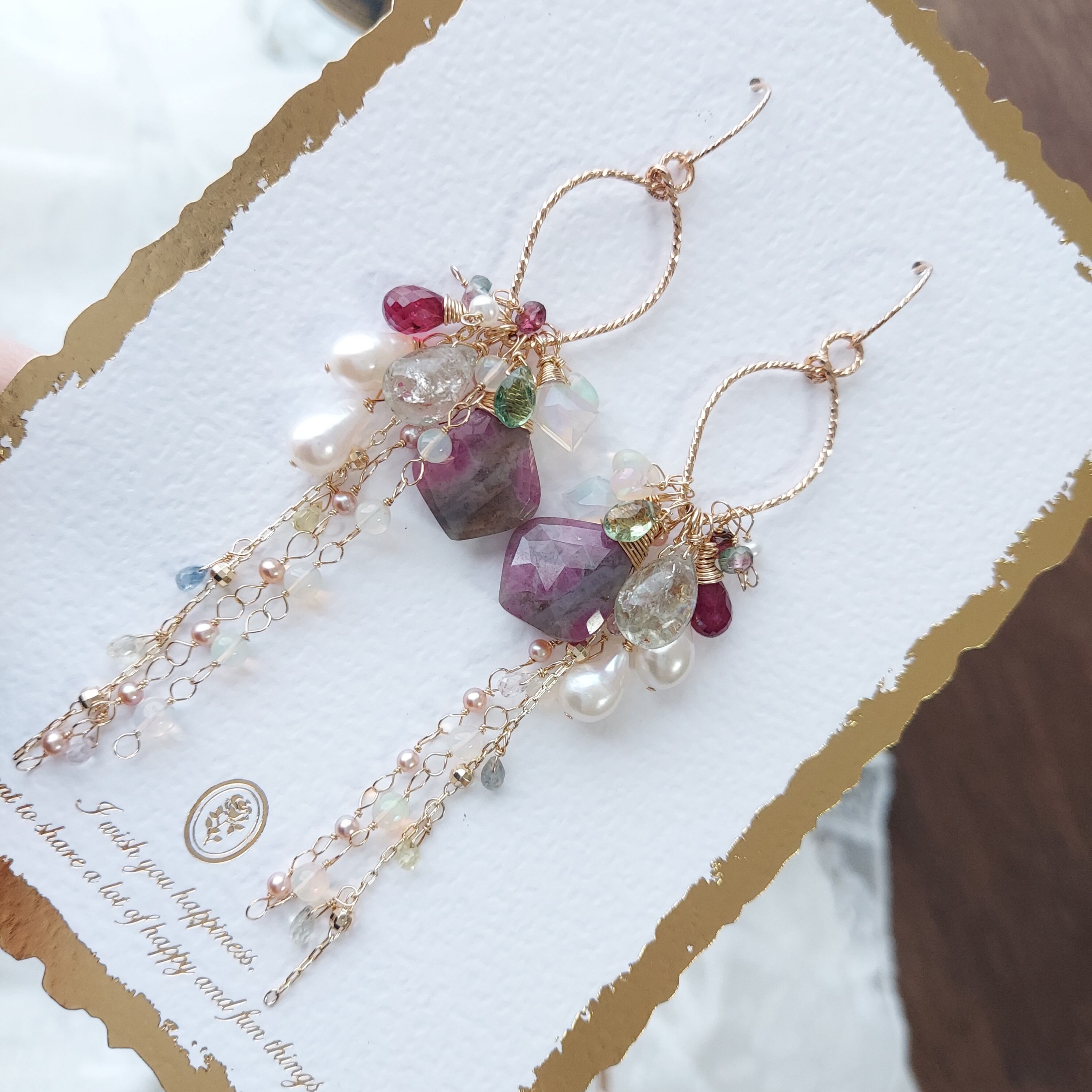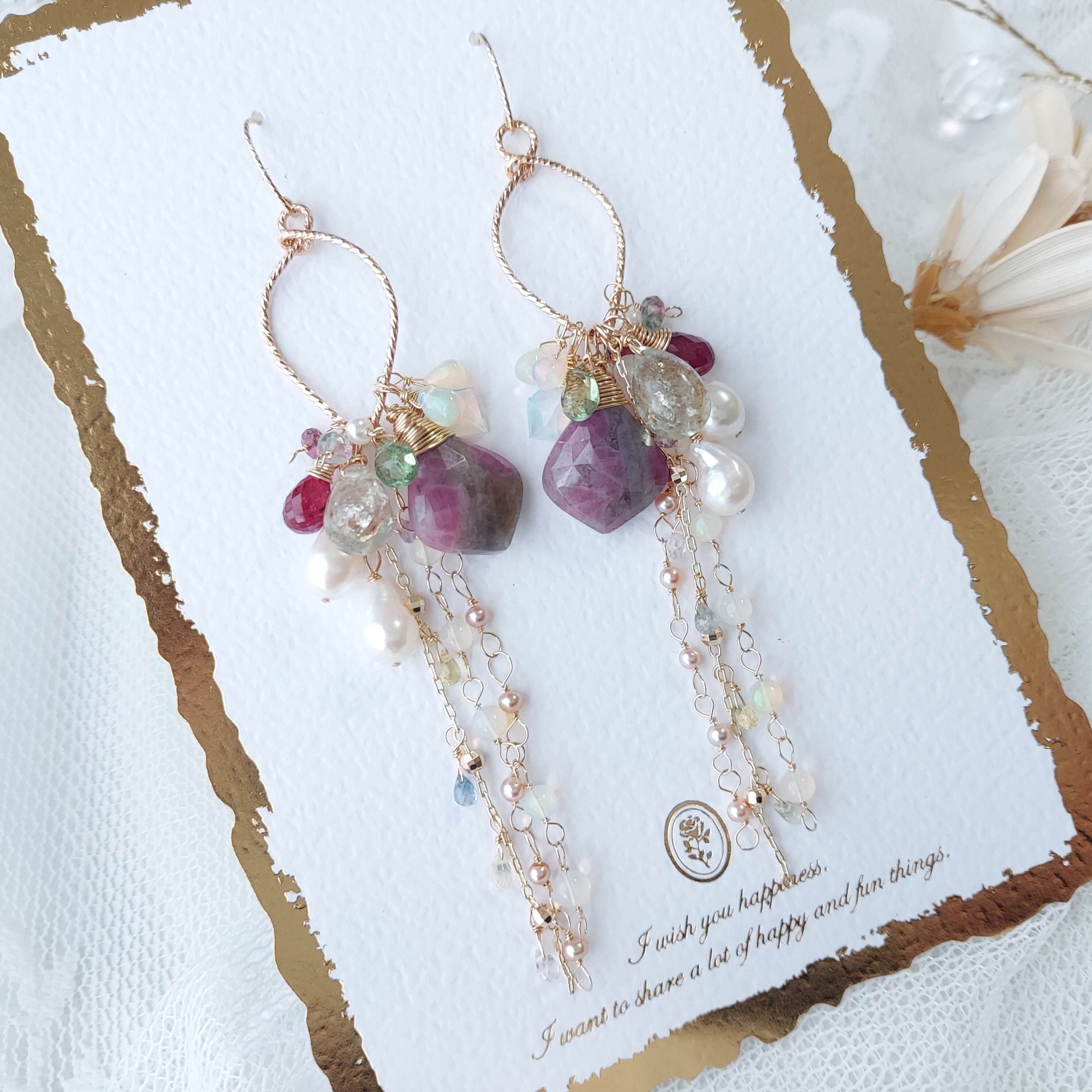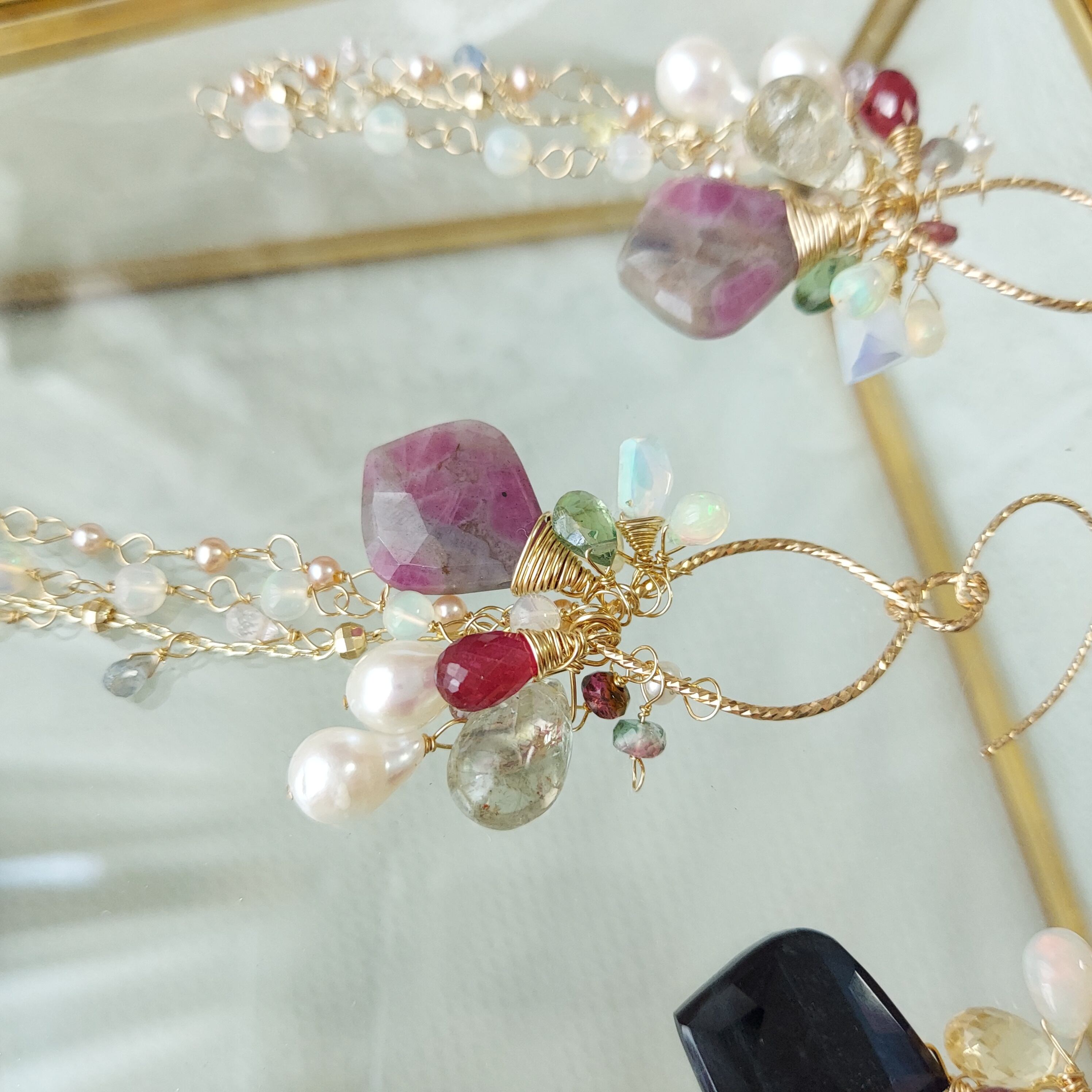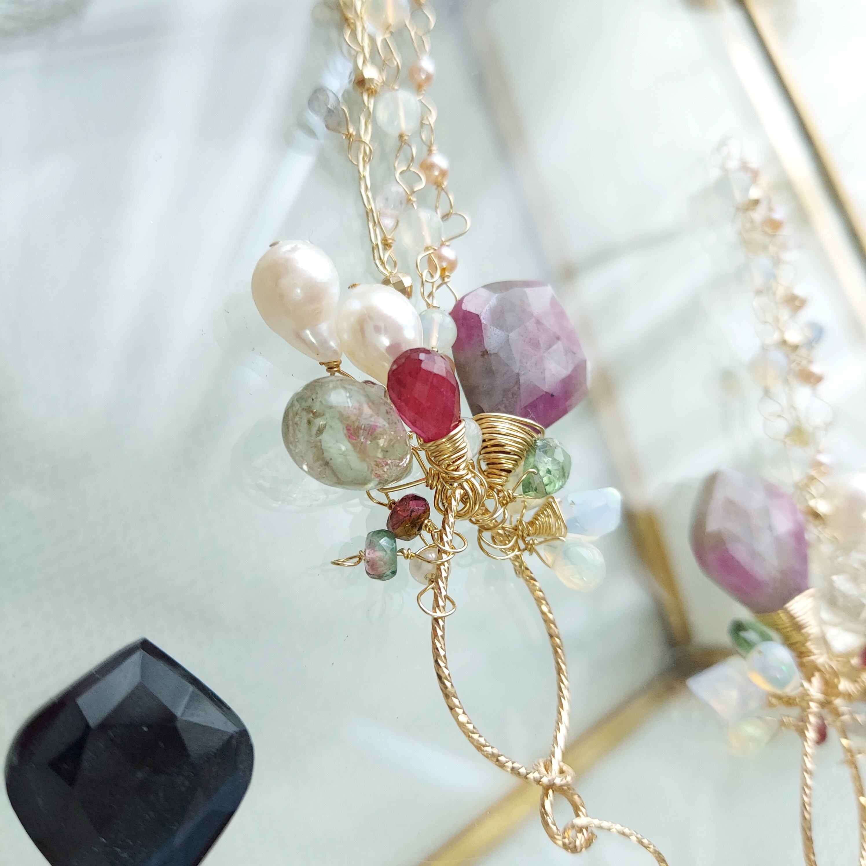 一目惚れしたルビーインフェルドスパーのリーフシェイプに、大粒のフェルドスパーサンストーンや、とても高品質なサファイアなどを合わせました♡