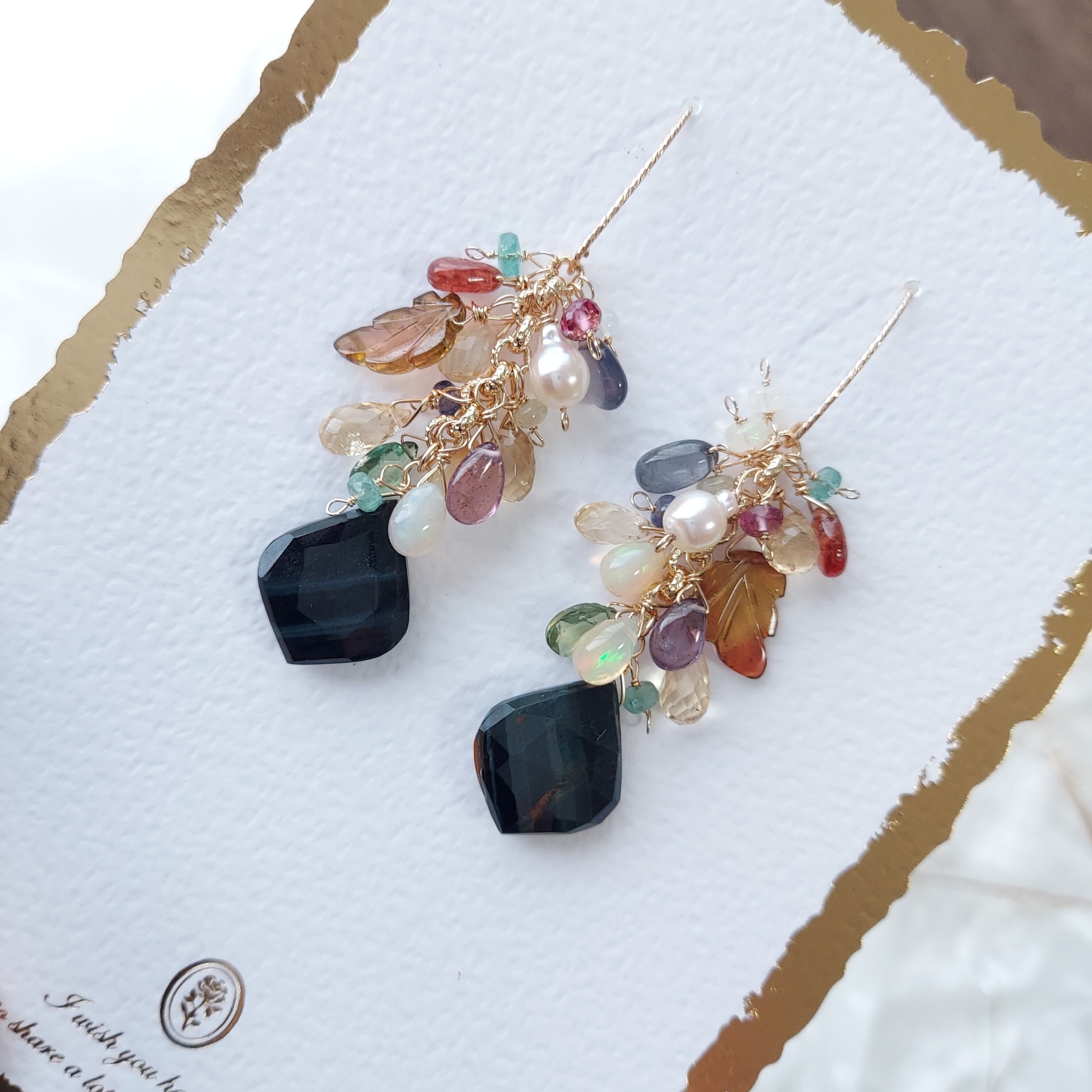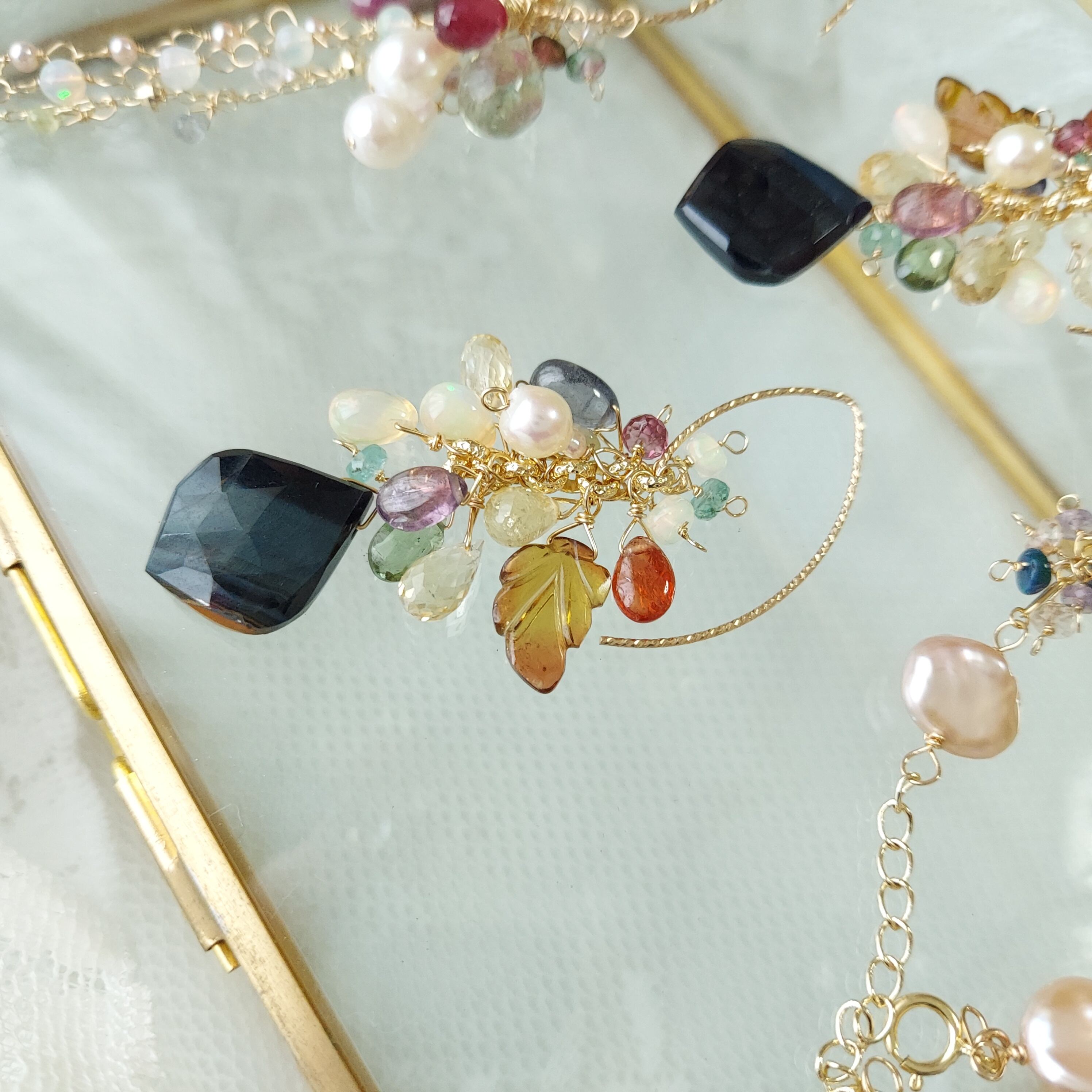 こちらも一目惚れしたブラックタイガーアイのリーフシェイプに、大きくて美しいトルマリンのリーフ、発色の良いスピネルやエメラルドの小粒などを合わせて豪華に仕上げました♡