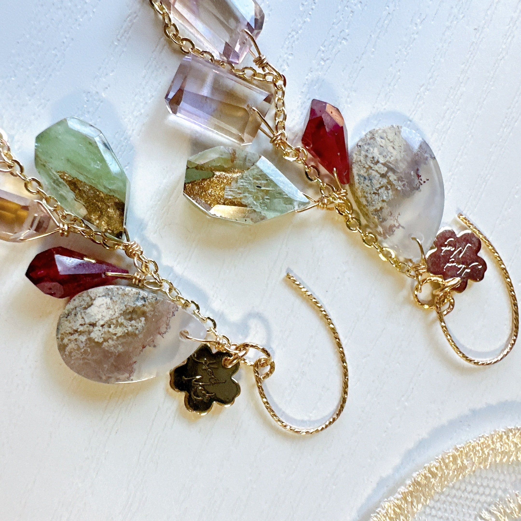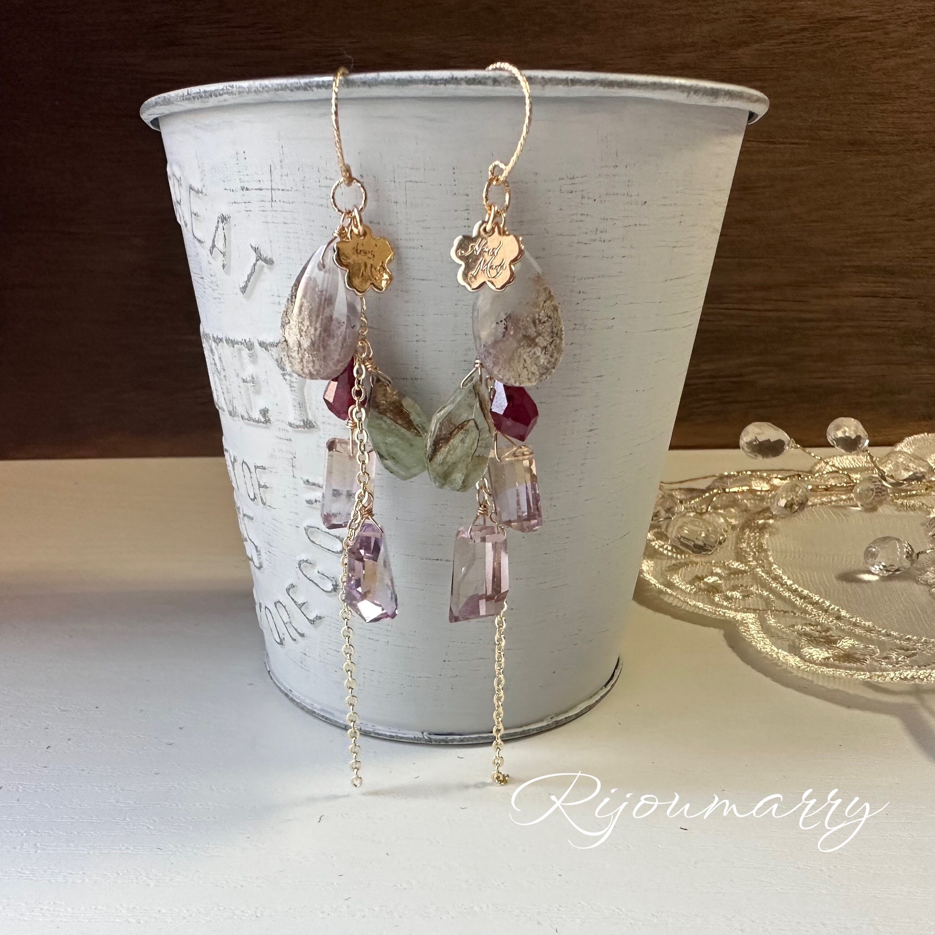 ホワイト系の柔らかなモスアゲートに、キラキラ輝く優しい色味のアメトリン、ルビーなどを合わせました(*'▽'*)